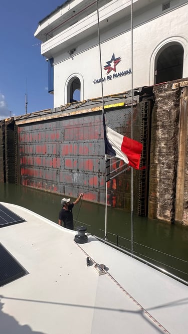 We crossed the Panama Canal in two stages, spending one night anchored on Gatun Lake. It was a special experience we shared with the family. Throughout the transit, an advisor accompanied us to guide the maneuvers and coordinate the passage through the locks.